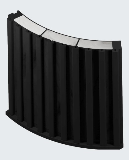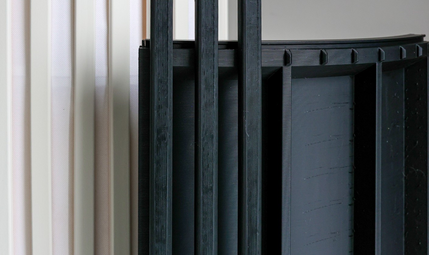 Our technology is a linkage of 3D layered material primarily engineered for optimal human speech frequency absorption and an optimized geometry designed for maximum sound dispersion through curved material surfaces.