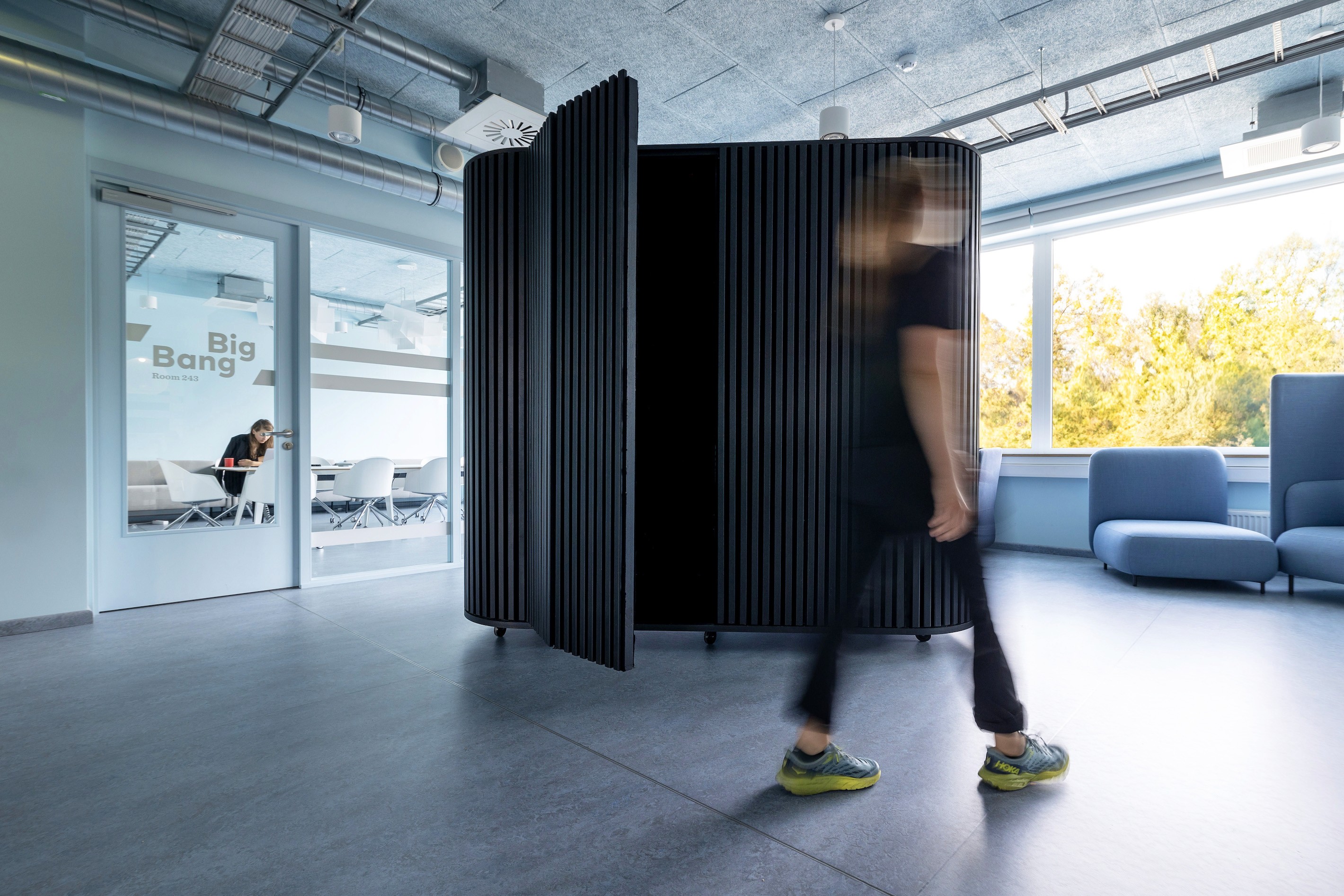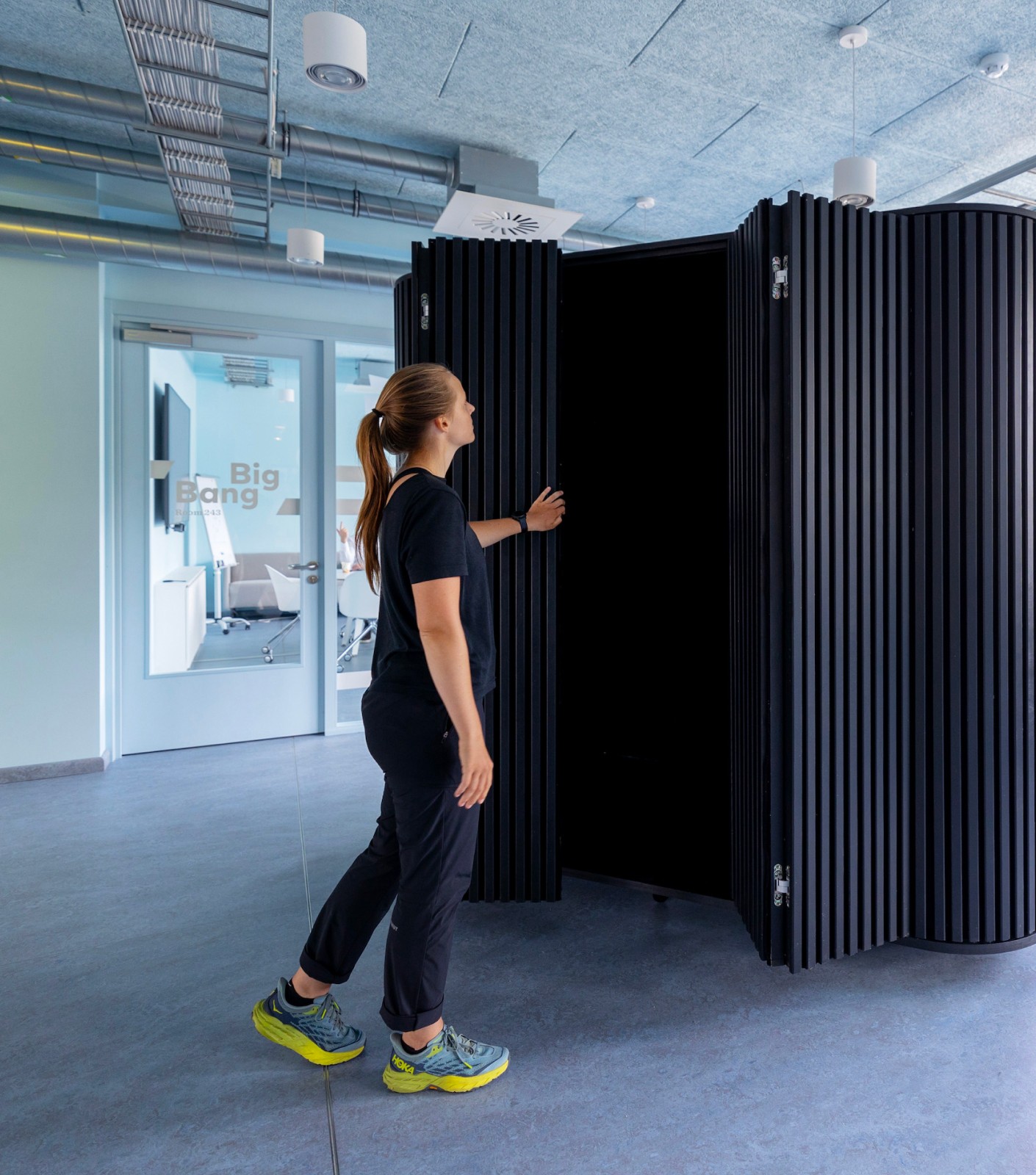 Combining highly sound absorbing materials; and geometry optimised for sound scattering we lower reverberation and improve intelligibility between closeby people.